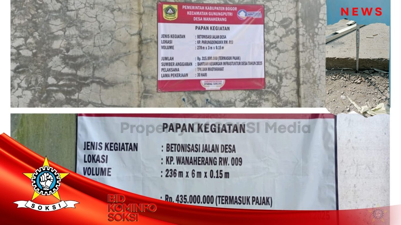 BOGOR, SOKSIMEDIA|Pekerjaan betonisasi jalan desa di wilayah Desa wanaherang Kecamatan Gunung Putri, Kabupaten Bogor yang bersumber dari Bantuan Keuangan Infrastruktur Desa (Bankeu Infrastruktur Desa) Tahun Anggaran 2025 menuai sorotan publik.…