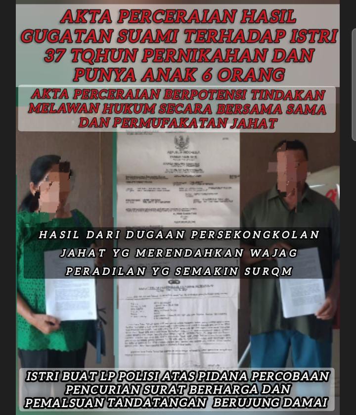 Bahwa diketahui proses perceraian hubungan Astia dengan NP (60) yakni suaminya selain secara sepihak dalam laporan pembuatan akta perceraian di pengadilan agama tersebut diduga ada kejanggalan, informasi yang diperoleh pembuatan/pendaftaran akta perceraian NP (60) di tanggal 03 Maret 2025 kemudian surat Akta Perceraian diterima Ibu Astia (56) pada pagi 05 Maret 2025. Artinya diduga proses pembuatan dan atau pendaftaran akta perceraian nya tersebut sangat cepat dan tanpa melibatkan atau memanggil Ibu Astia (56)