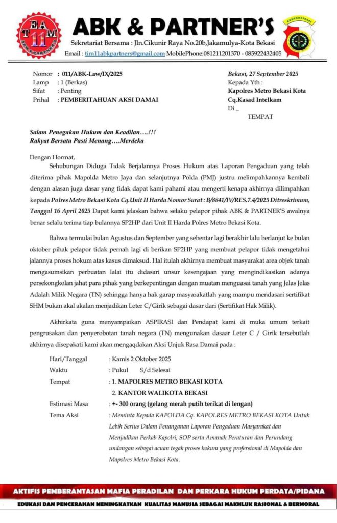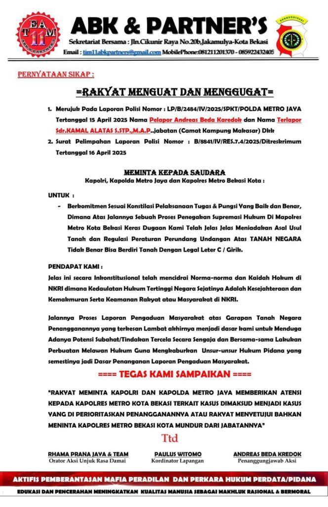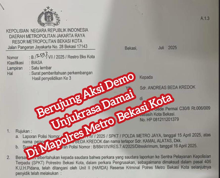 POLRES METRO BEKASI KOTA AKAN DIDEMO RAKYAT, ATAS DASAR LAMBATNYA PENANGANAN DIDUGA ADA PERBUATAN TERCELA TUK SENGAJA MELINDUNGGI PIHAK TERLAPOR
