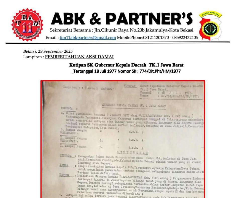 Pertama, Undang-Undang Pokok Agraria (UUPA) No. 5 Tahun 1960 secara jelas mewajibkan negara memberikan kepastian hukum hak atas tanah melalui penerbitan sertifikat (Pasal 19). Faktanya, SK Gubernur Jawa Barat tertanggal 23 Desember 1972 yang sah secara hukum diabaikan, sementara masyarakat justru dipaksa menyerahkan SK mereka dan diganti dengan girik tanpa dasar yang jelas.
