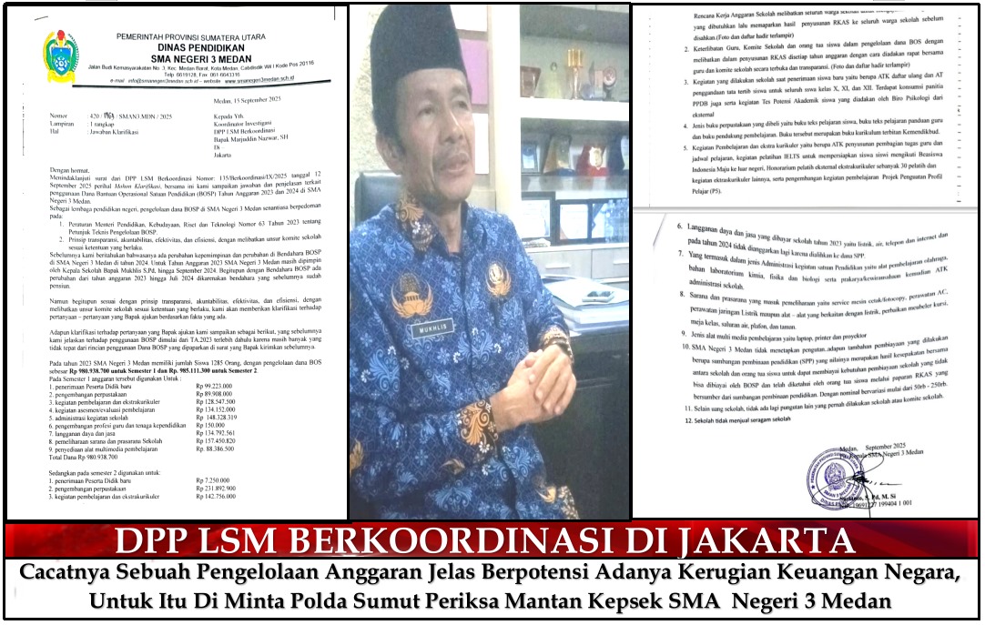 Demikian disampaikan koordinator wilayah LSM Berkoordinasi Samsir menanggapi dugaan penyelewengan dana Bantuan Operasional Satuan Pendidikan (BOSP) yang terjadi di SMA Negeri 3 Medan tahun anggaran 2023 dan 2024.