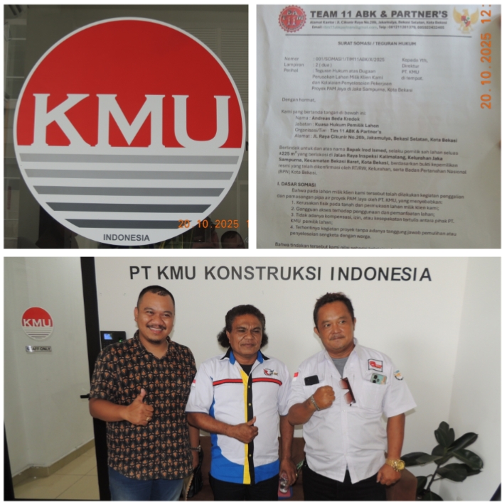 Permasalahan dugaan perusakan lahan pribadi oleh pihak PT KMU terus bergulir. Team 11 ABK & Partner’s yang diketuai Andreas Beda Kredok resmi mendatangi kantor PT KMU di Jalan Caman Raya, Jatibening, Kecamatan Pondok Gede, Kota Bekasi, pada Senin (20/10/2025) untuk menyerahkan surat somasi/teguran hukum yang pertama.