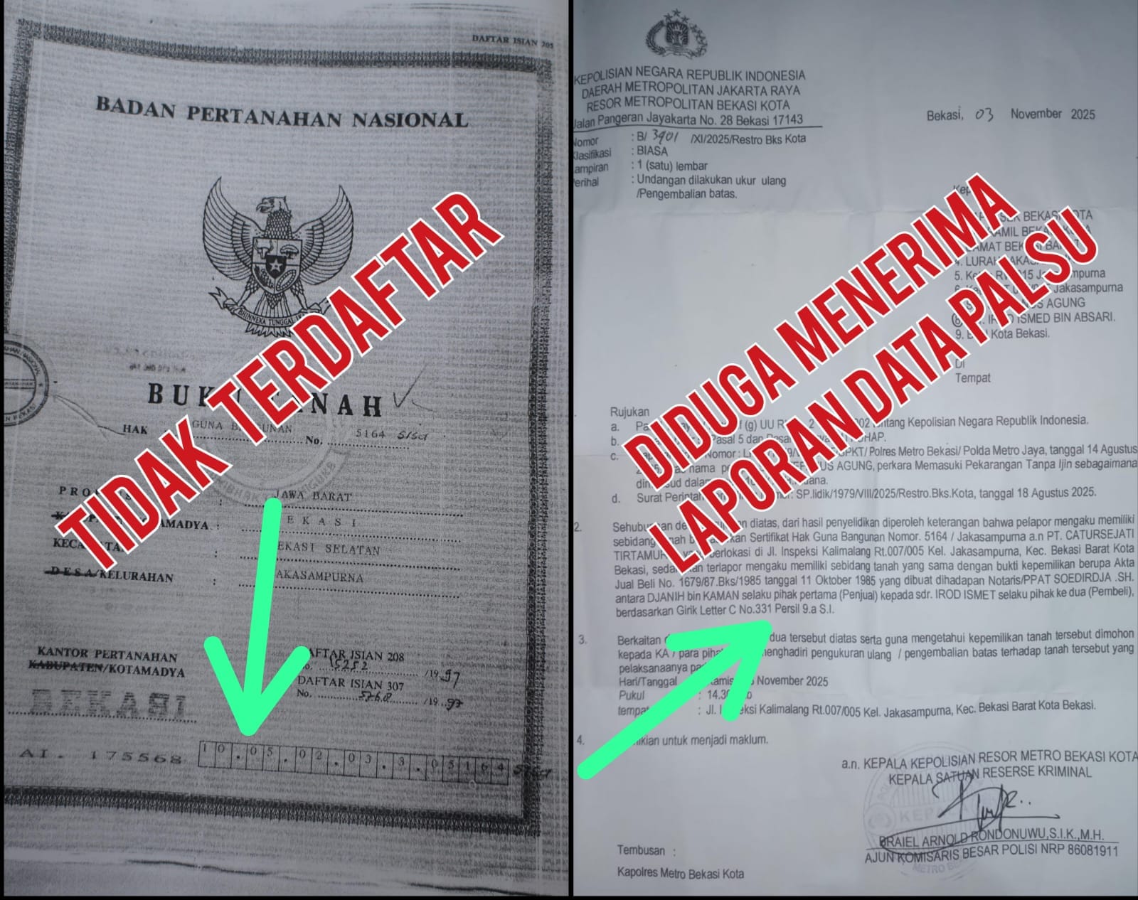 “Pelapor mengaku memiliki tanah di Jalan Inspeksi Kalimalang, RT 007/015 Jakasampurna, berdasarkan SHGB Nomor 5164 atas nama PT Catur Sejati Tirtamurni, tapi setelah kami cek ke BPN Kota Bekasi, data tersebut tidak tercatat sama sekali,” ungkap Andreas kepada wartawan, Sabtu (8/11/2025).