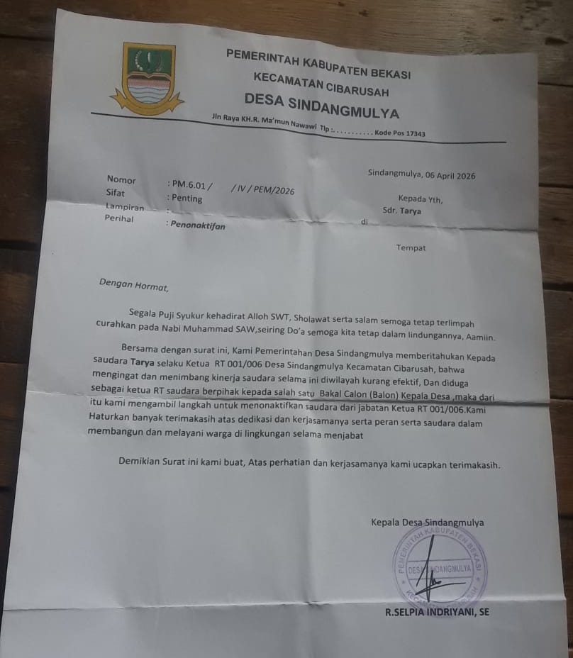‎Surat tersebut ditandatangani langsung oleh Kepala Desa Sindang Mulya, R. Selpia Indriyani, secara resmi menonaktifkan Sdr. Tarya dari jabatannya sebagai Ketua RT 001/006. Alasan yang tercantum adalah kinerja kurang efektif dan diduga berpihak kepada salah satu bakal calon (balon) kepala desa.